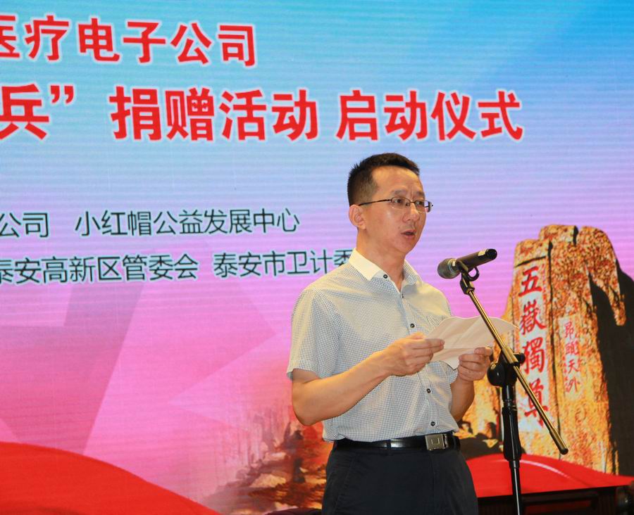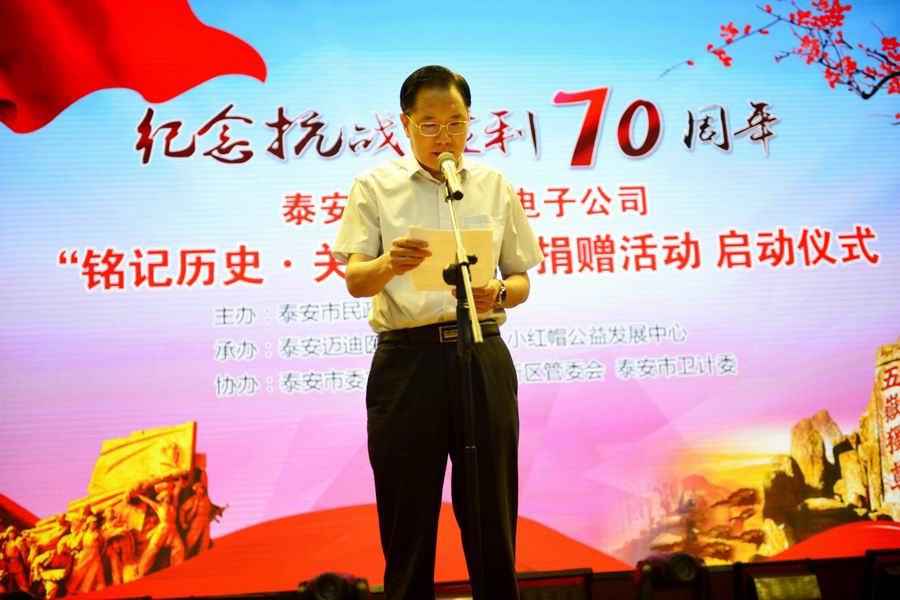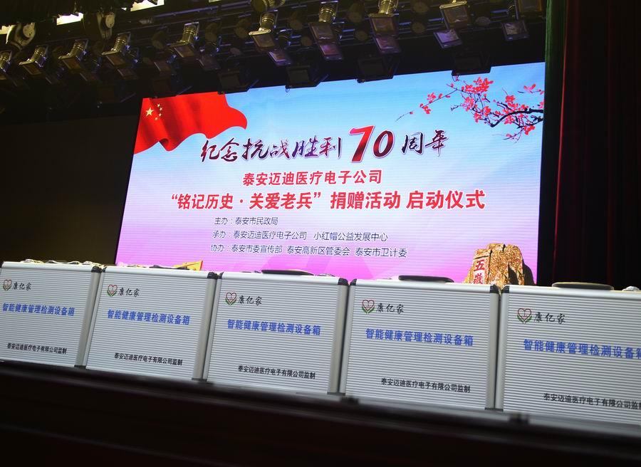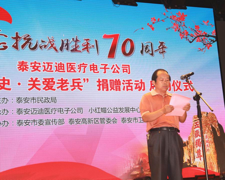 為紀念抗日戰(zhàn)爭暨世界反法西斯戰(zhàn)爭勝利70周年,弘揚抗戰(zhàn)精神,褒揚抗戰(zhàn)老戰(zhàn)士,泰安市邁迪醫(yī)療電子有限公司發(fā)展不忘回報社會,在泰安市民政局的指導下,拿出遠程家庭健康檢測產品,為抗戰(zhàn)老兵送愛心、送健康。 2015年8月24日,在泰安市傳媒集團演播大廳,泰安邁迪公司紀念抗戰(zhàn)勝利70周年“銘記歷史·關愛老兵”捐贈活動啟動儀式,在溫暖、熱烈的氣氛下進行。泰安市副市長徐恩虎、泰安市民政局局長孫蘭俊、副局長董峰、泰安邁迪公司董事長范世忠、泰安市小紅帽公益發(fā)展中心主任張煥慶,以及縣市區(qū)、景區(qū)優(yōu)撫單位代表、社會愛心人士和廣大志愿者200余人參加。市委副秘書長于文龍主持儀式。