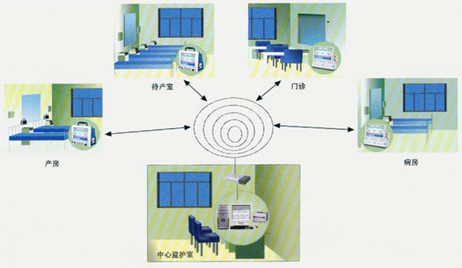 若醫(yī)院現(xiàn)有房屋不適于重新布線,或有時各房間相距較遠且監(jiān)護床邊機經(jīng)常需要移動時,可選擇無線中央監(jiān)護方案.各床邊機和中央監(jiān)護著重點之間通過無線方式進行數(shù)據(jù)通訊,各床邊機移動靈活方便,省去了布線及改變現(xiàn)有房屋現(xiàn)狀的麻煩.