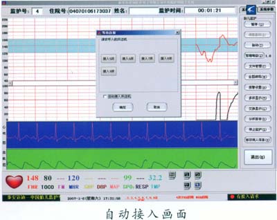 床邊機一開機進入監(jiān)護狀態(tài),孕婦的住院號、姓名及各種監(jiān)護信息自動的傳到中央監(jiān)護主機上,自動啟動中央監(jiān)護工作站開始監(jiān)護,監(jiān)護結(jié)束后自動存儲監(jiān)護信息, 實現(xiàn)了自動監(jiān)護無人值班,極大方便了臨床應(yīng)用。