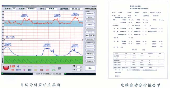 在監(jiān)護中對胎心率基線、細變異大小、加速、各種減速及胎動的變化進行實時在線分析,并將分析結(jié)果顯示在屏幕上,監(jiān)護結(jié)束時對所有的監(jiān)護信息進行綜合分析,給出監(jiān)護診斷結(jié)果及胎兒評分供臨床參考,使得每個婦產(chǎn)科大夫都能輕松進行胎兒監(jiān)護圖形分析和診斷。